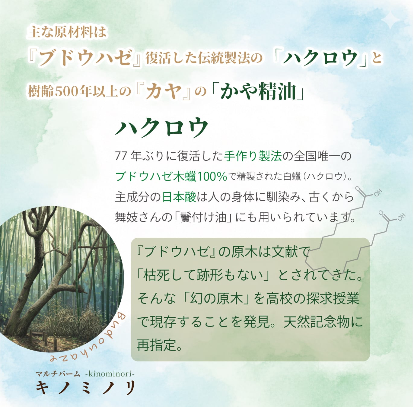 ●マルチバーム「キノミノリ」は地域の歴史と希望を肌に纏う「物語」を高校生の情熱的な探求とそれに応えた地域産業のコラボレーションで企画開発された商品です。 ご自身のお守りバームとして、また大切な方への贈り物としても、ぜひお選びください。